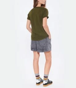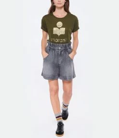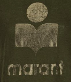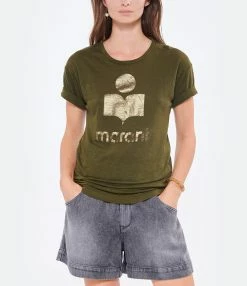 Tee-shirt en lin kaki. Col rond. Manches courtes retroussées. Logo et sérigraphie bronze. Coupe droite. Base arrondie.