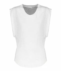Tee-shirt en lin blanc. Col rond côtelé. Épaules froncées et élastiquées. Manches courtes avec bords rabattus. Coupe droite. Base arrondie.