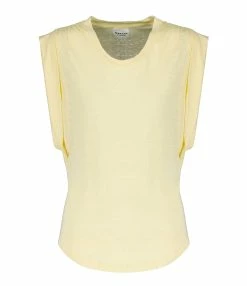 Tee-shirt en lin jaune. Col rond côtelé. Épaules froncées et élastiquées. Manches courtes avec bords rabattus. Coupe droite. Base arrondie.