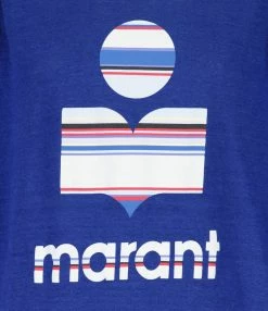 Tee-shirt en lin bleu avec le logo Marant à rayures multicolores flocké sur le devant. Col rond côtelé. Épaules plissées. Manches courtes chauve-souris. Coupe ample. Base droite.