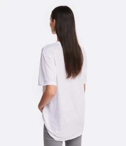 Tee-shirt en lin blanc orné du logo “MARANT” flocké en argenté sur le devant. Col rond côtelé. Manches courtes. coupe droite. Base droite.