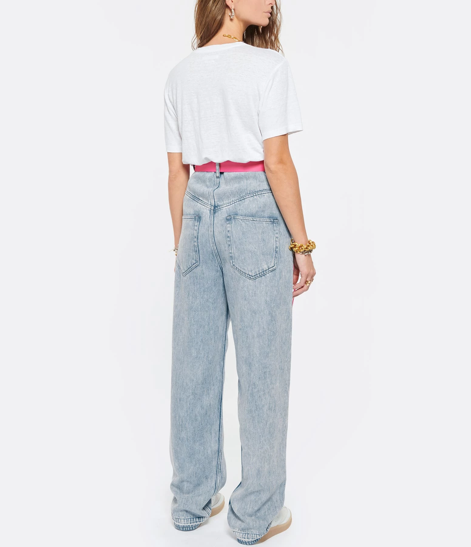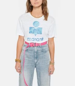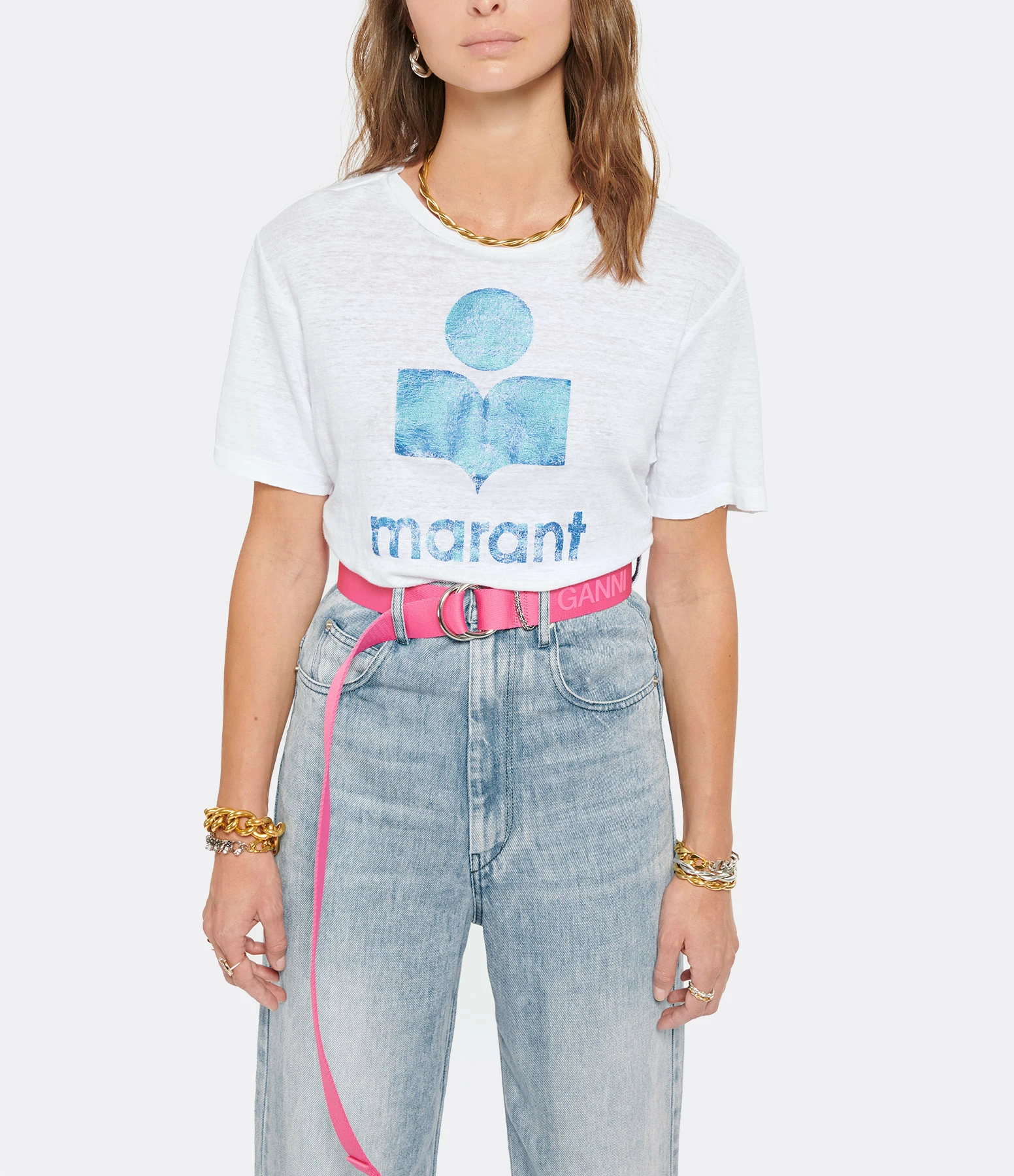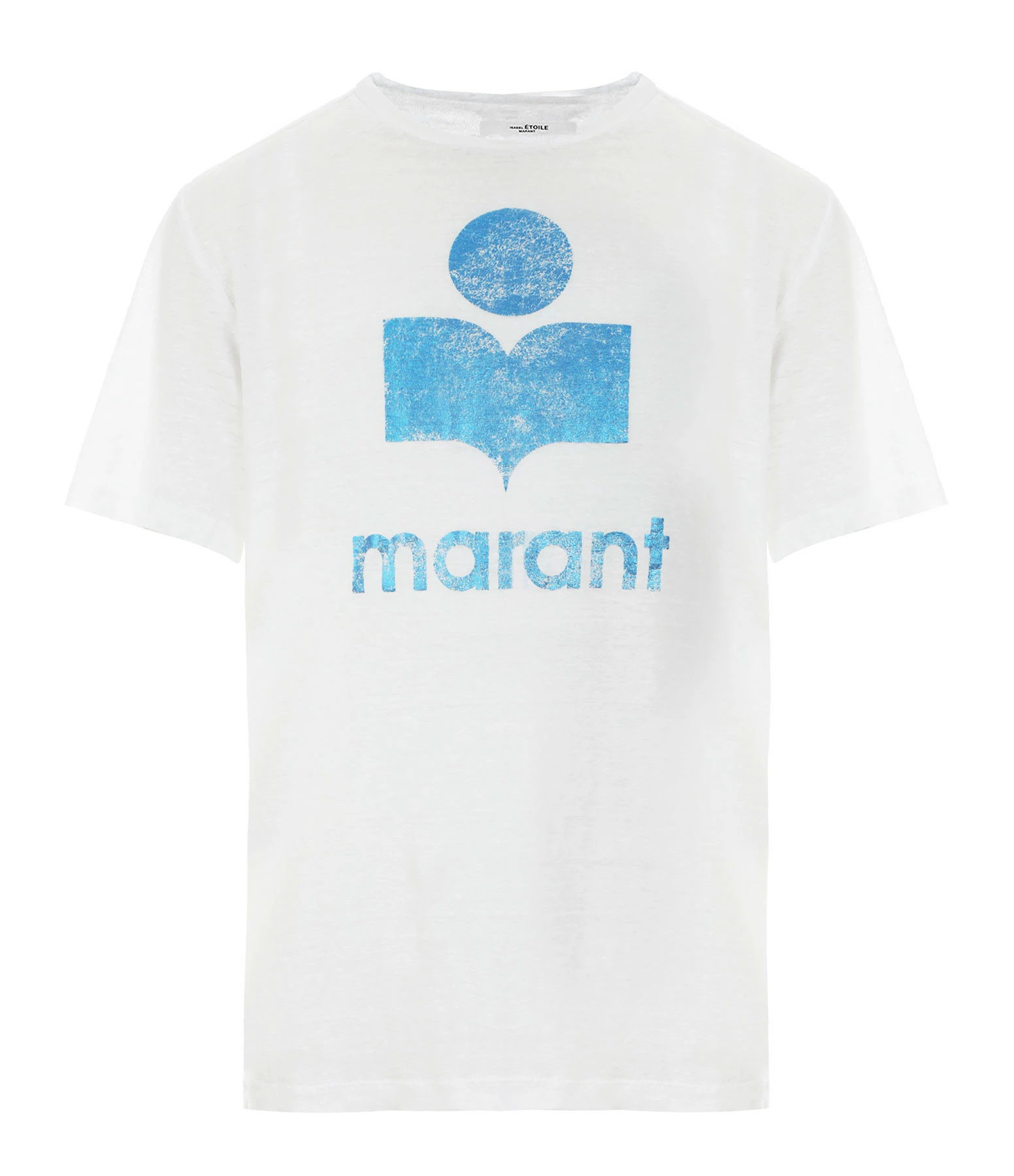Tee-shirt en lin blanc. Col rond. Manches courtes. Logo et sérigraphie bleu métallisé. Coupe large. Base arrondie.