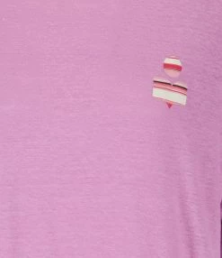 Tee-shirt en lin rose avec le logo à rayures dans des tons roses et beiges flocké sur la poitrine et dans le dos. Col rond côtelé. Manches courtes. Coupe droite. Base droite.