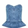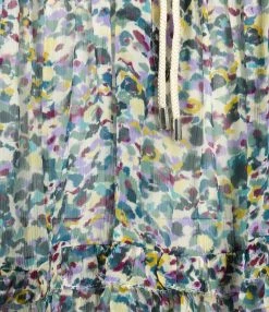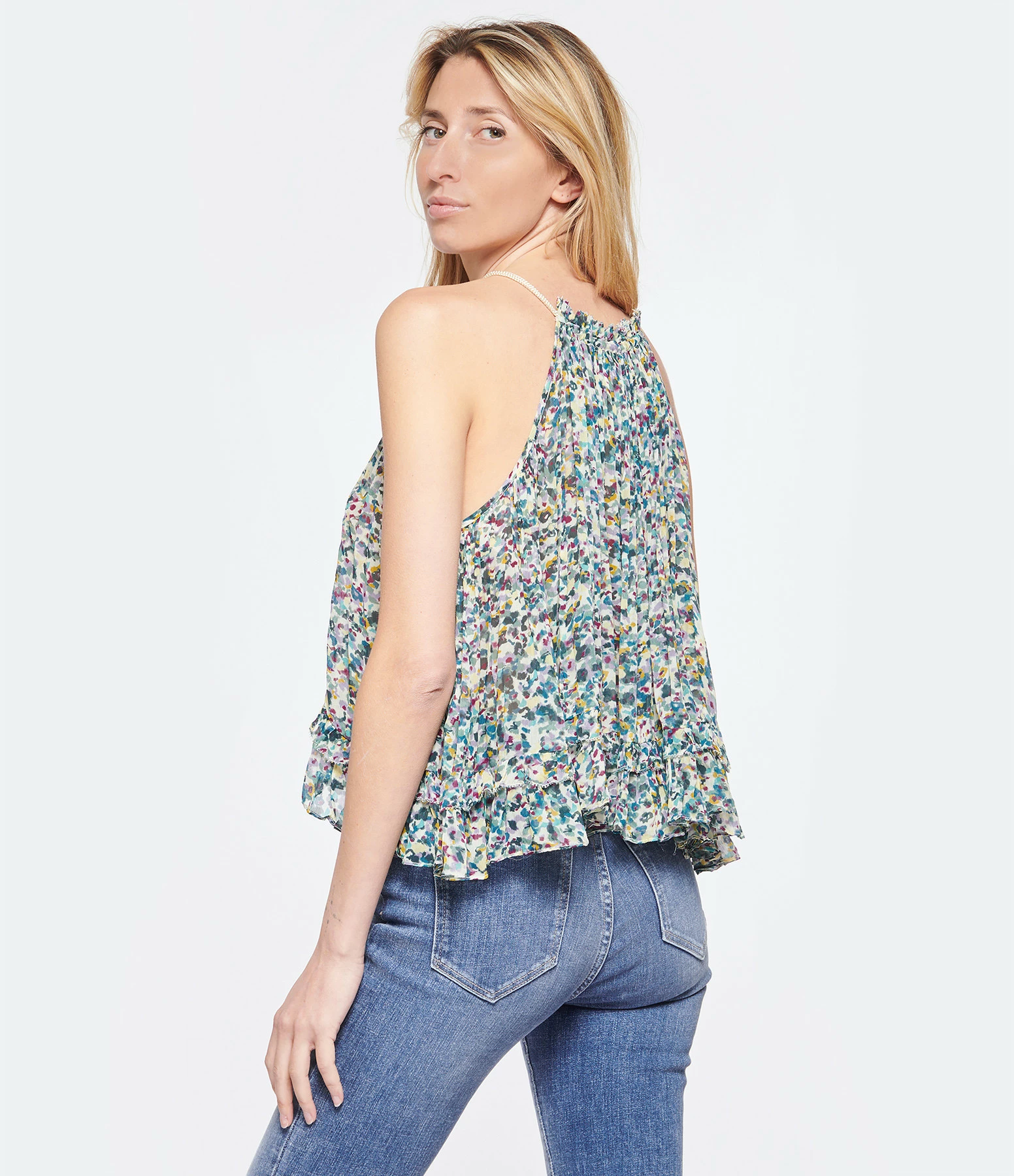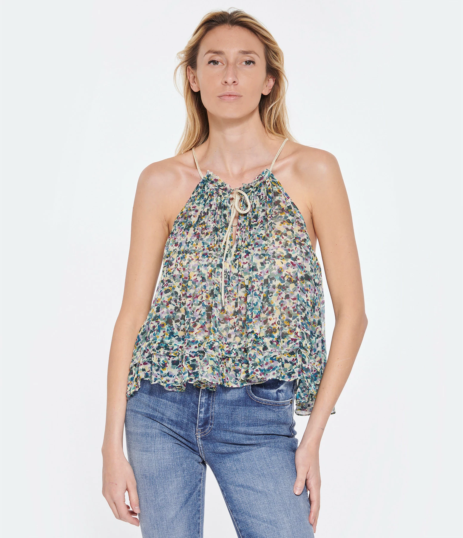 Top à imprimé dans des tons verts orné de fronces et de volants. Col montant à volants avec lien de serrage. Sans manches. Coupe ample. Base asymétrique volantée.