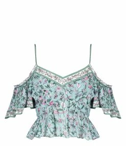 Top à volants en coton à imprimé floral vert. Encolure en V. Épaules ajourées avec fines brettelles et manches courtes. Coupe droite. Base asymétrique.