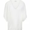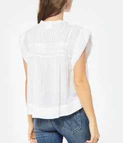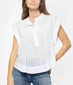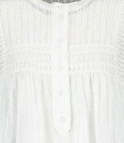Top en coton blanc orné de fronces. Col rond. Manches courtes avec bords rabattus. Demi-patte boutonnée sur le devant. Petits bouton blancs nacrés. Coupe ample. Base droite.