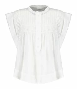 Top en coton blanc orné de fronces. Col rond. Manches courtes avec bords rabattus. Demi-patte boutonnée sur le devant. Petits bouton blancs nacrés. Coupe ample. Base droite.