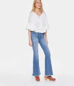 Top en coton mélangé blanc orné de fronces. Col rond à encoche avec cordons de serrage à pompons. Manches 3/4 évasées et à volants. Coupe ample. Base arrondie volantée.