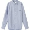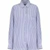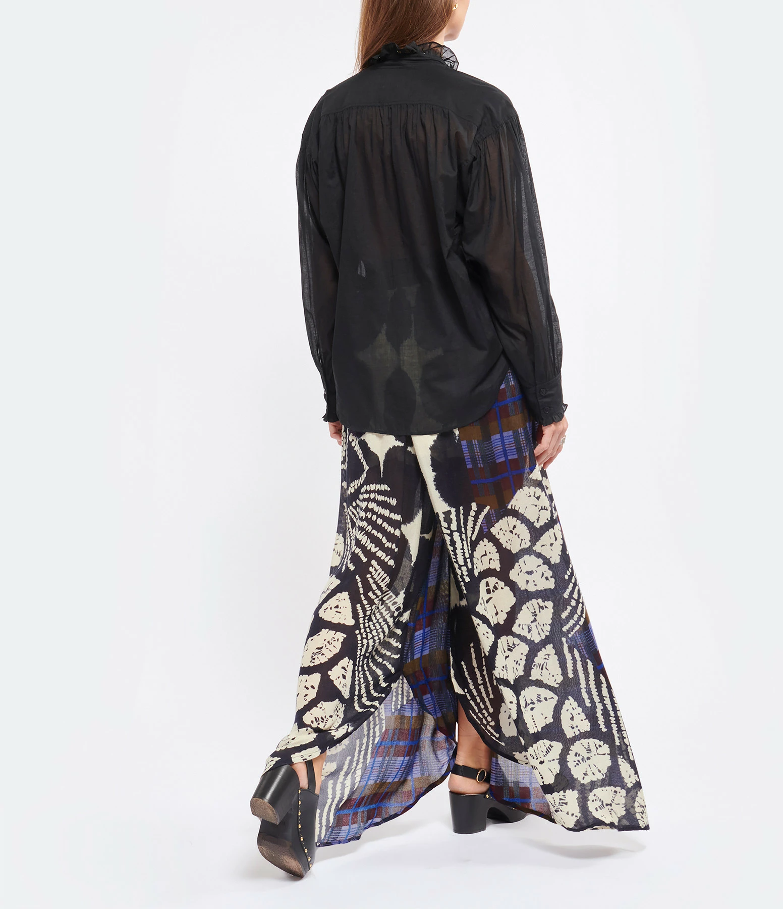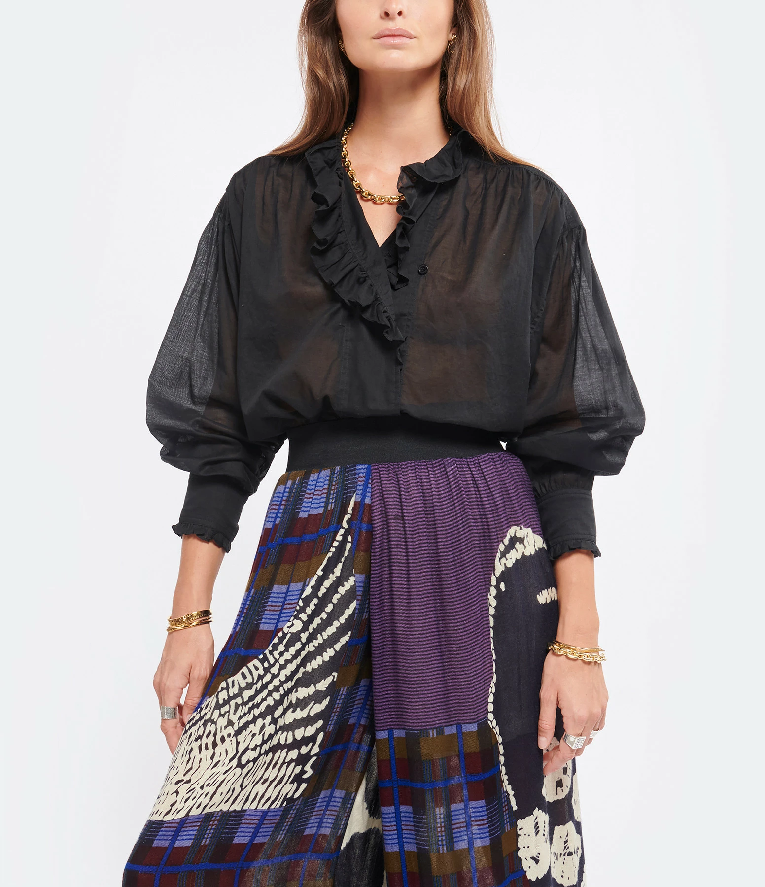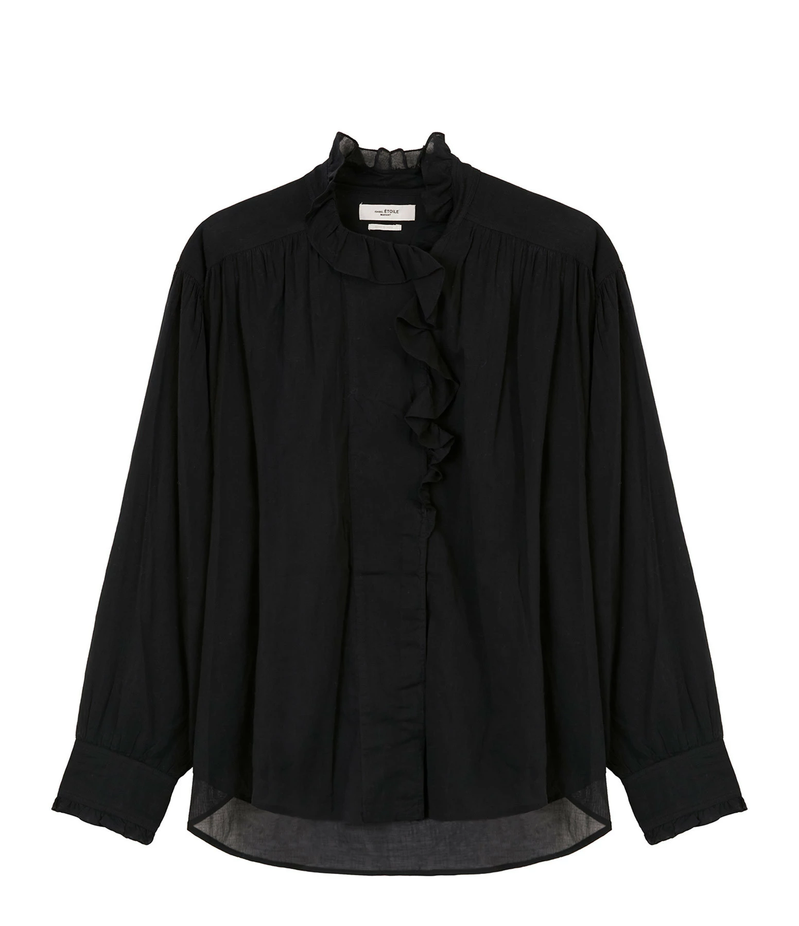 Chemise en coton noir. Manches longues bouffantes avec fentes et poignets boutonnés. Col montant avec volants. Coutures épaules et dos froncées. Fermeture boutonnée avec patte de boutonnage cachée ornée de volants sur le devant. Coupe droite ample. Légèrement plus longue à l’arrière. Base arrondie. Non doublée.