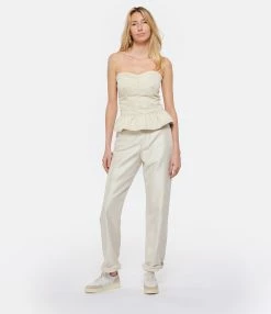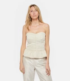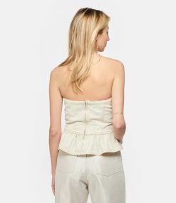 Bustier en coton écru. Encolure cœur. Sans manches. Coupe cintrée. Base ornée de volants.