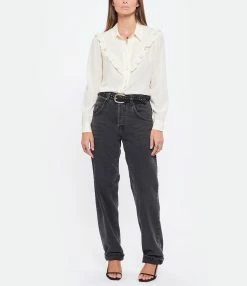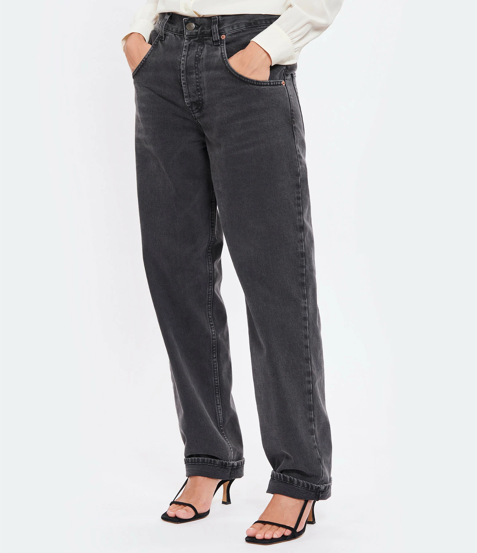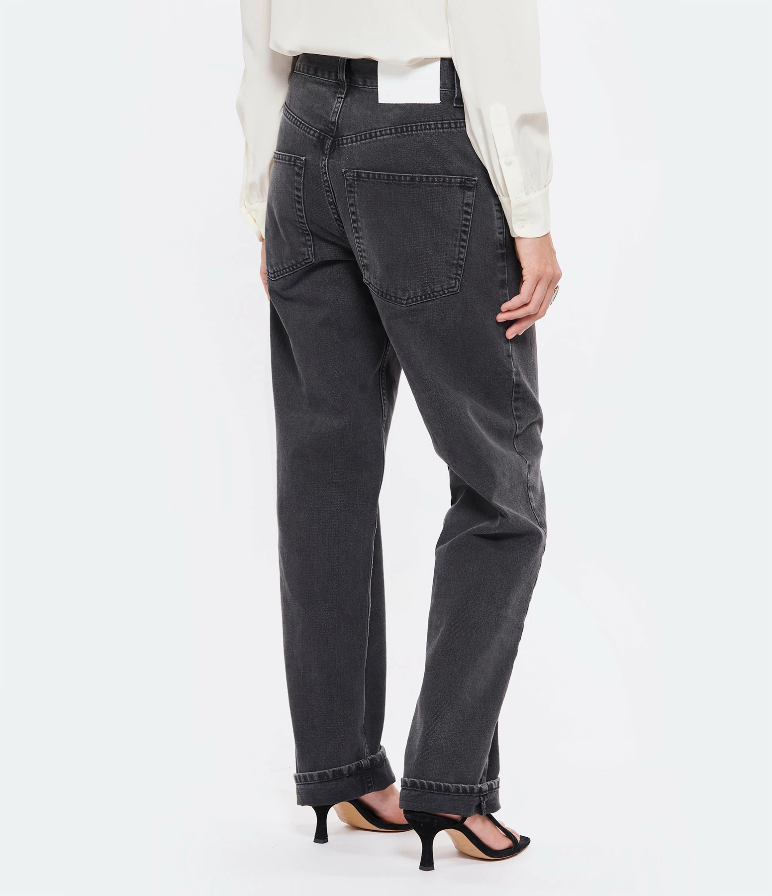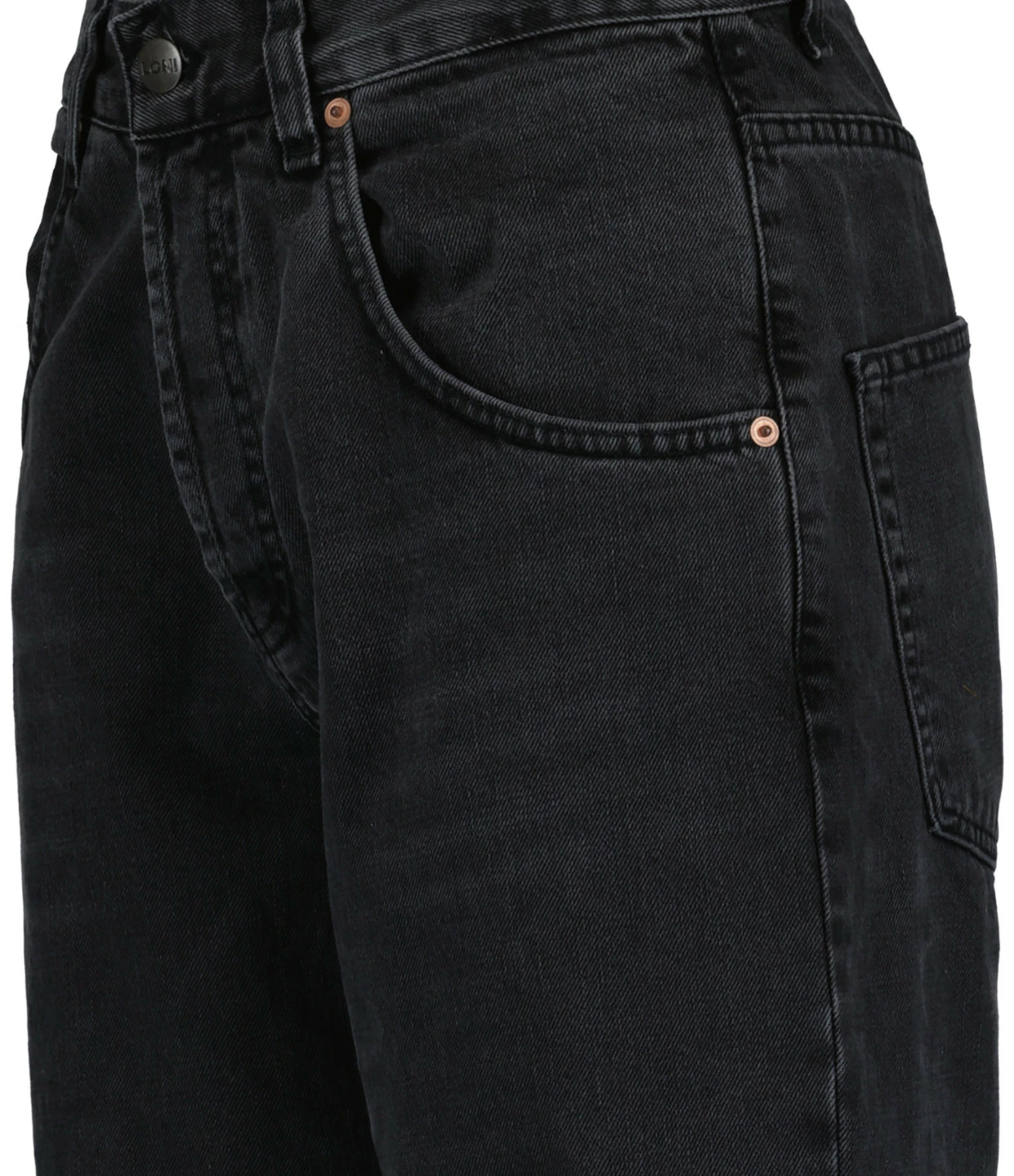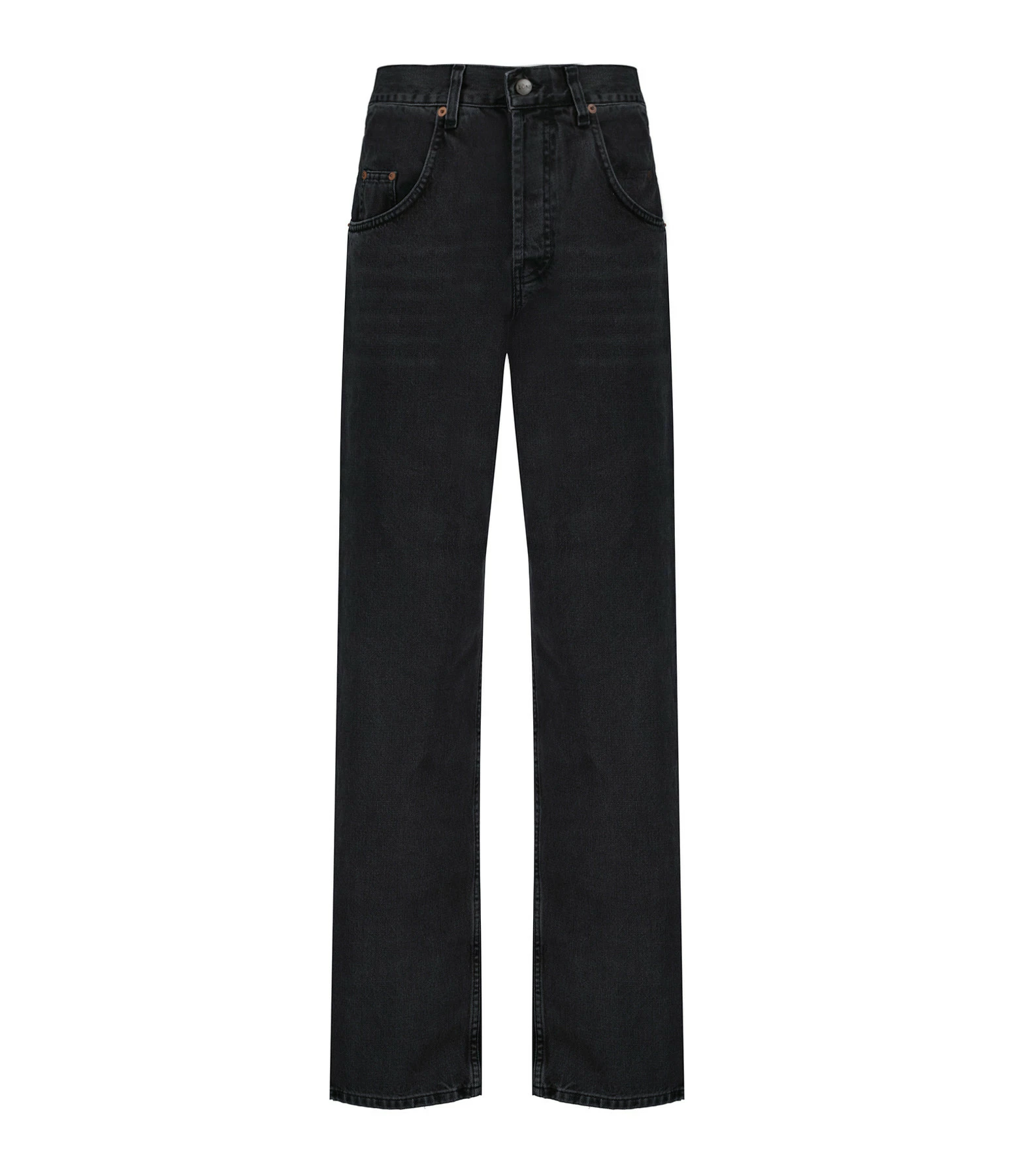 Pantalon en denim de coton noir délavé. Passants pour ceinture. Braguette boutonnée. Boutons et rivets métalliques. Deux poches italiennes et une poche à gousset. Deux poches plaquées dans le dos. Jacron blanc dans le dos. Coupe large. Base droite.