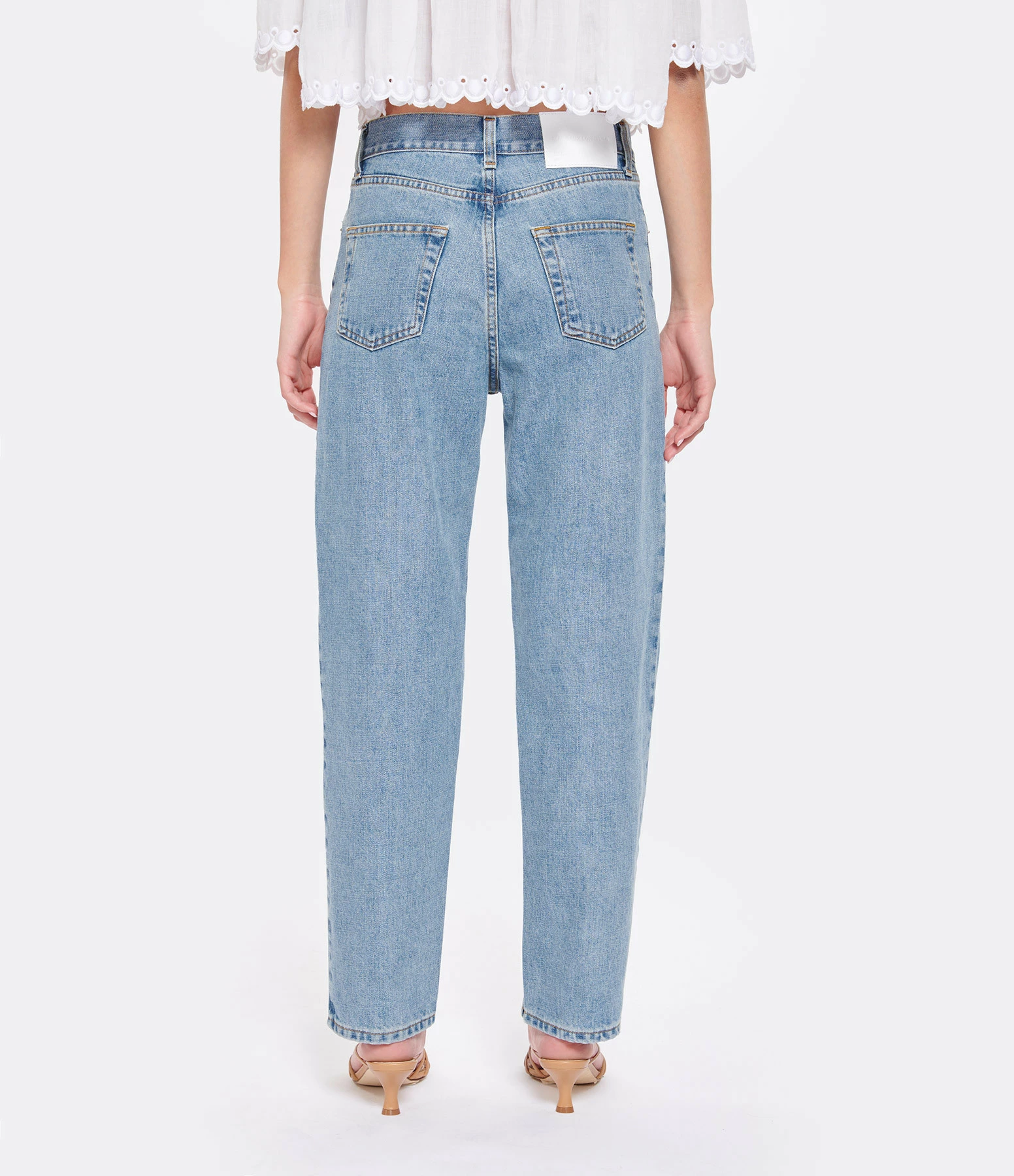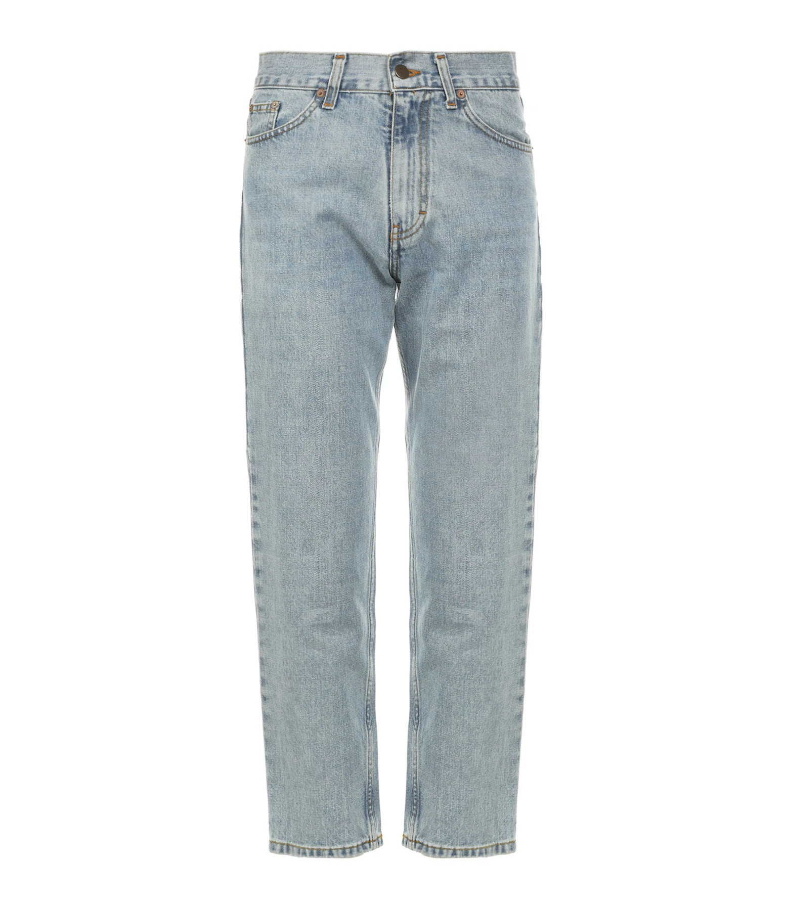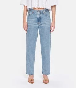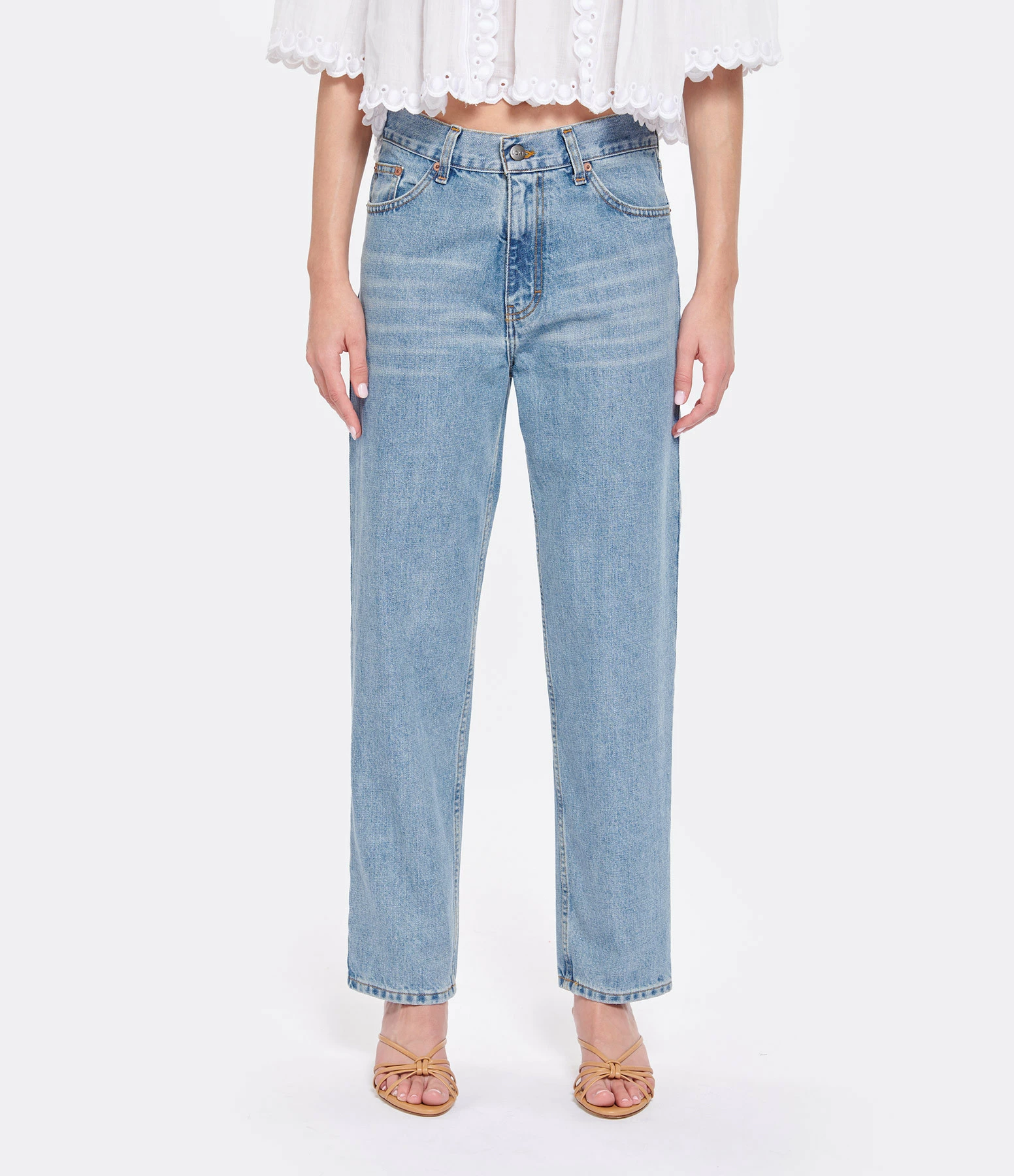 Jean en denim bleu. Taille haute. Cinq poches. Fermeture par zip et bouton. Coupe droite.
