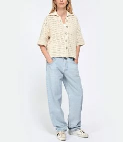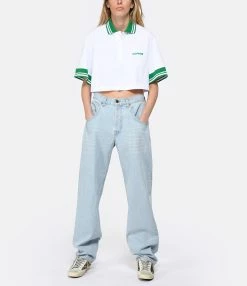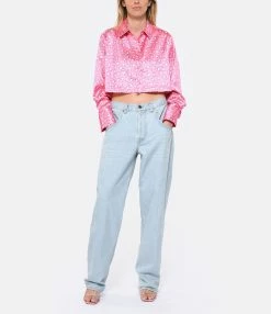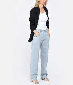Jean oversize en denim de coton bleu clair. Passant pour ceinture. Cinq poches. Jacron en cuir lisse à l’arrière. Coupe oversize. Base droite.