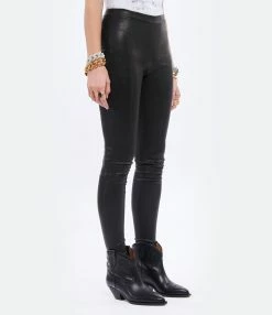 Pantalon legging en cuir stretch, pour femme. Coupe slim. Taille élastiquée. Bas de jambe coupé à cru.