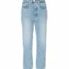 Jean large en denim de coton bleu clair. Fermeture par zip et bouton. Cinq poches. Passants pour ceinture. Coupe droite. Base droite.