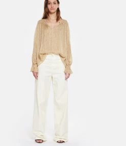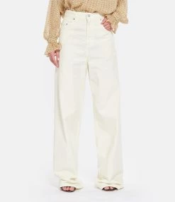 Jean large en denim de coton écru. Fermeture par zip et bouton. Cinq poches. Passants pour ceinture. Coupe droite. Base droite.