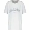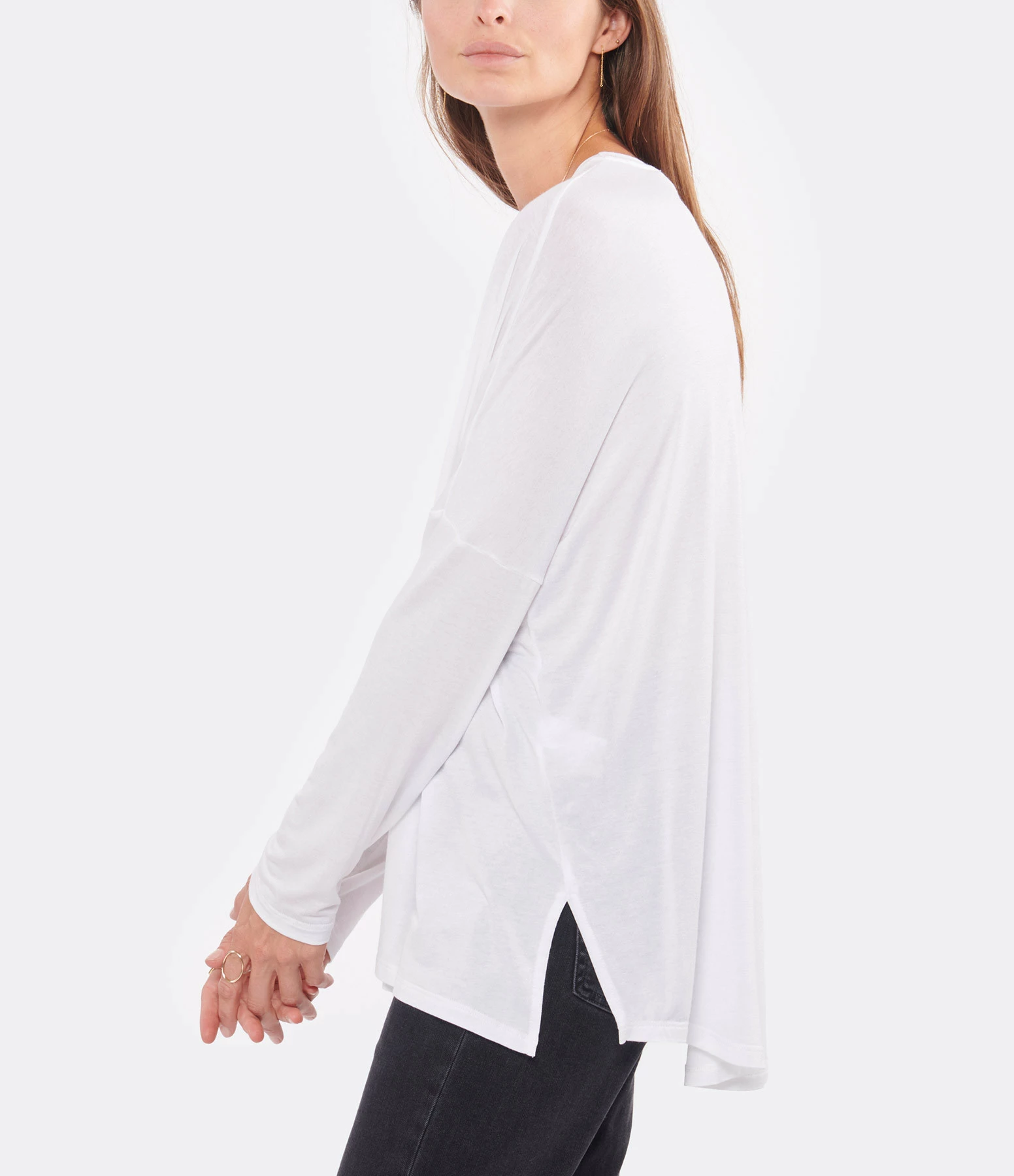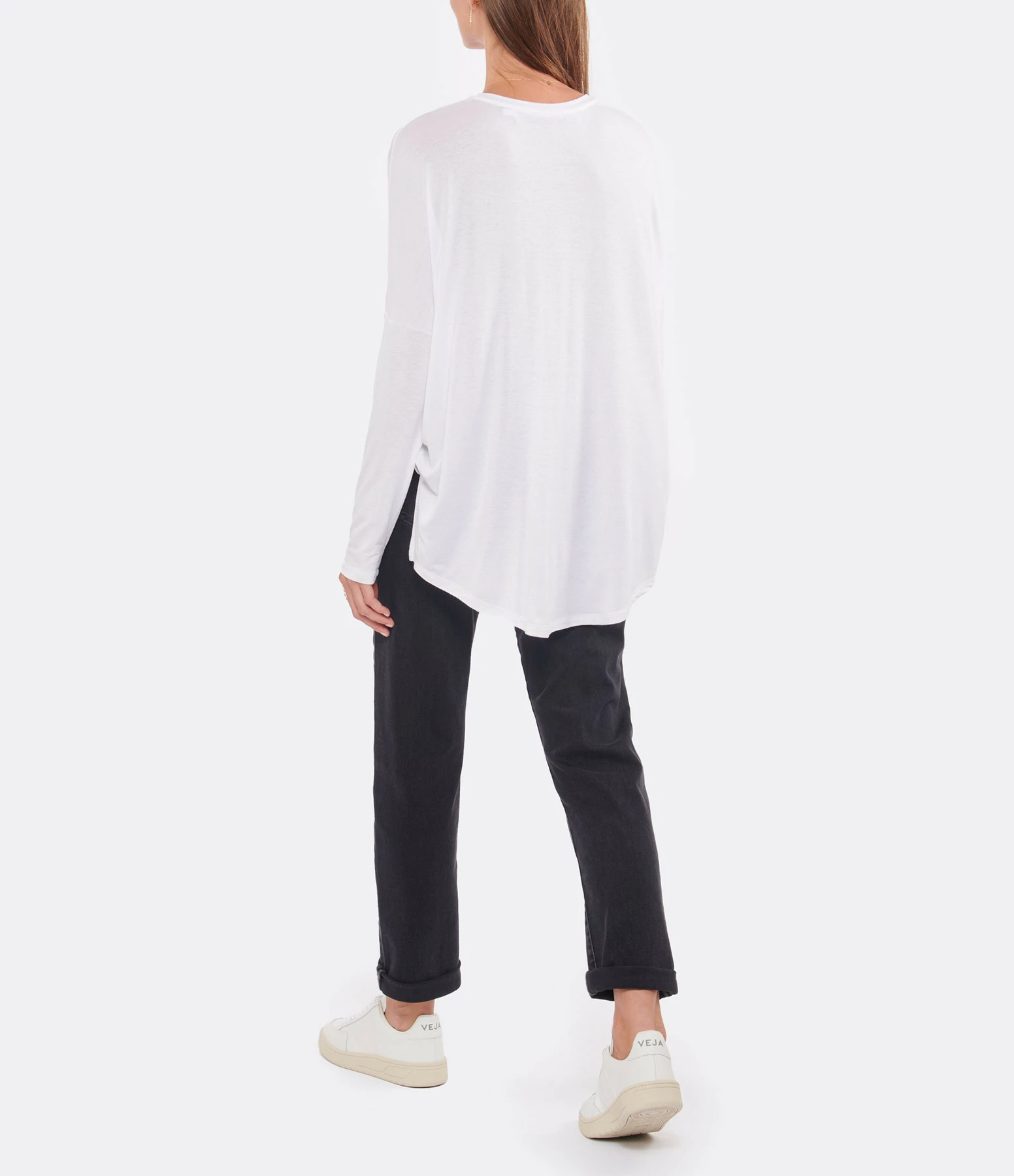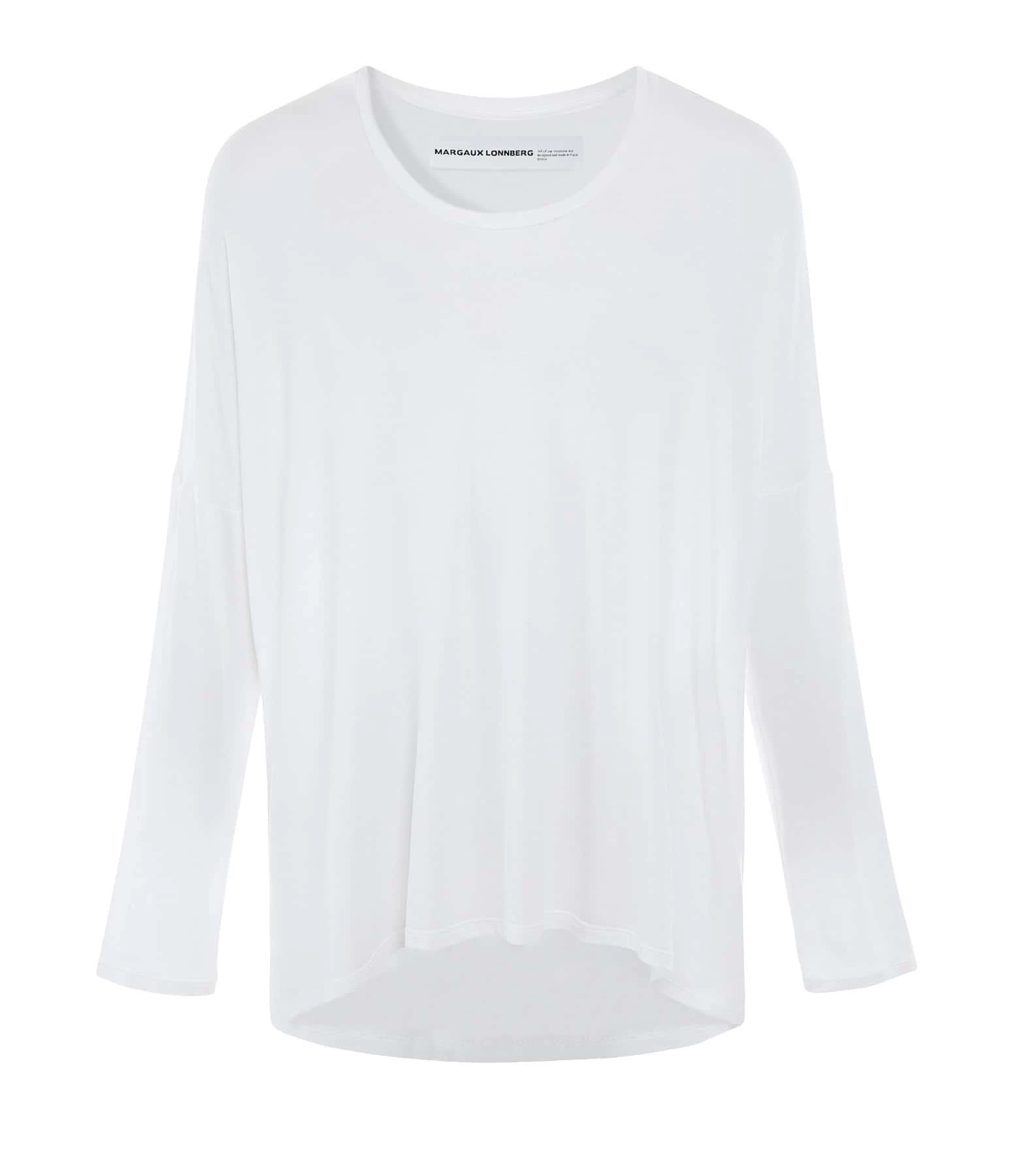 Tee-shirt fluide blanc. Col rond. Manches longues. Coupe ample. Base droite, plus longue et arrondie à l’arrière. Non doublé.