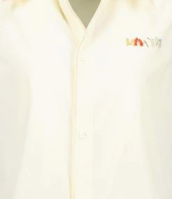 Robe courte jaune clair. Inscription “MARNI” brodé en perle niveau poitrine. Col chemisier. Sans manches. Fermeture par boutons sur le devant. Jeu de surpiqûre orange. Coupe droite. Base droite.