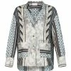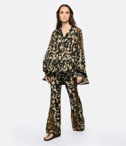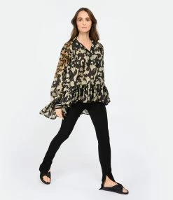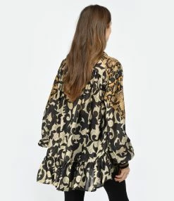 Blouse en soie à imprimé floral dans des tons marron. Col polo. Manches longues avec poignets en maille côtelée noir à bandes métallisées argenté et doré. Emmanchure et dos plissés. Coupe ample. Longueur plus courte sur le devant que dans le dos. Base à volant.