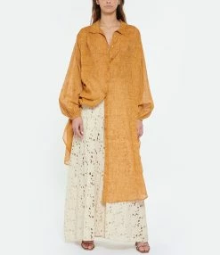 Longue chemise souple en coton ocre. Manches longues bouffantes élastiquées aux poignets. Col chemisier. Fermeture par boutons sur le devant. Fentes latérales au bas. Coupe droite. Base droite.