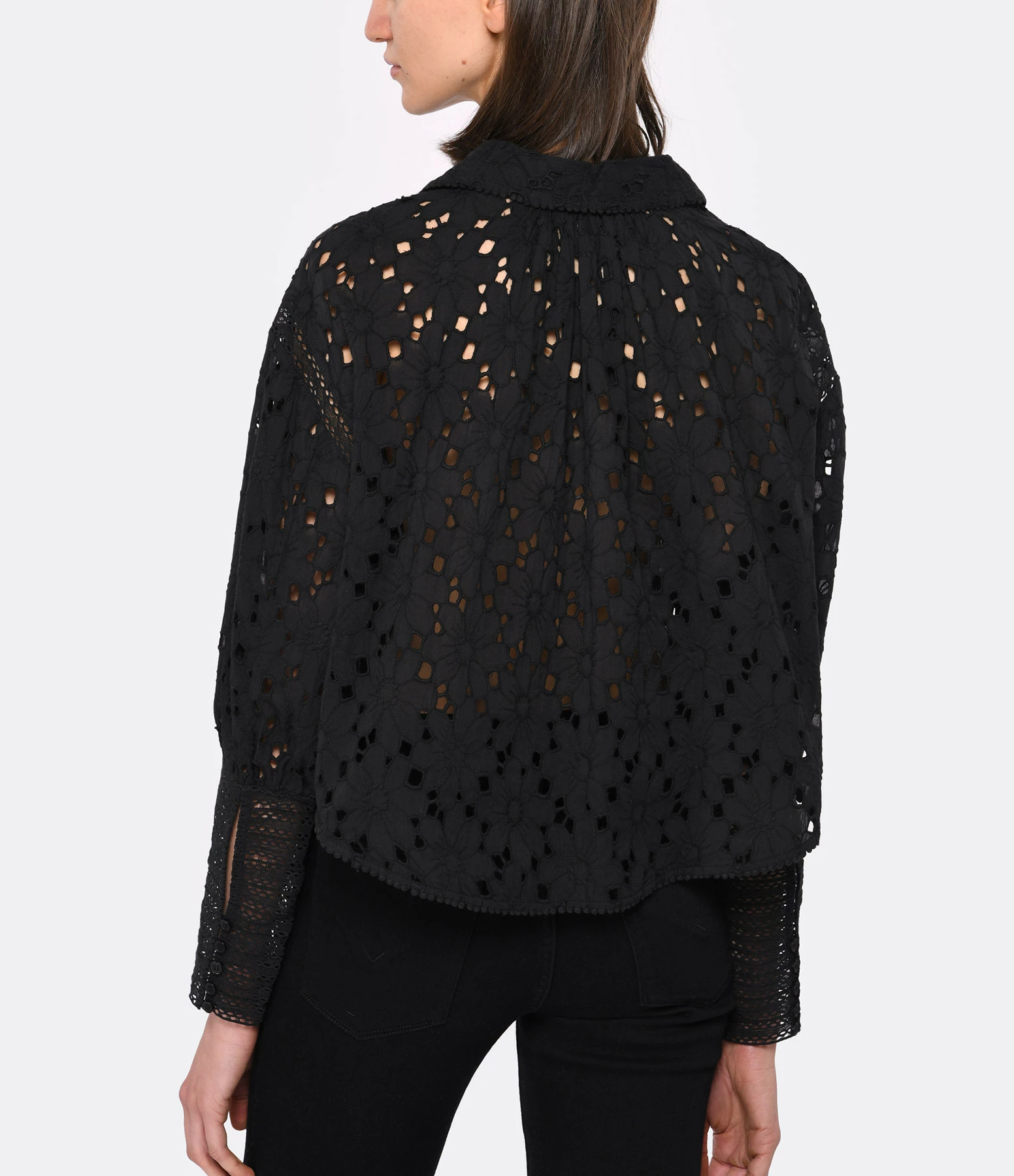 Chemise en broderie anglaise de coton noir. Effet ajouré. Manches longues bouffantes resserrées aux poignets. Col chemisier. Fermeture par boutons sur le devant. Coupe droite. Base droite.