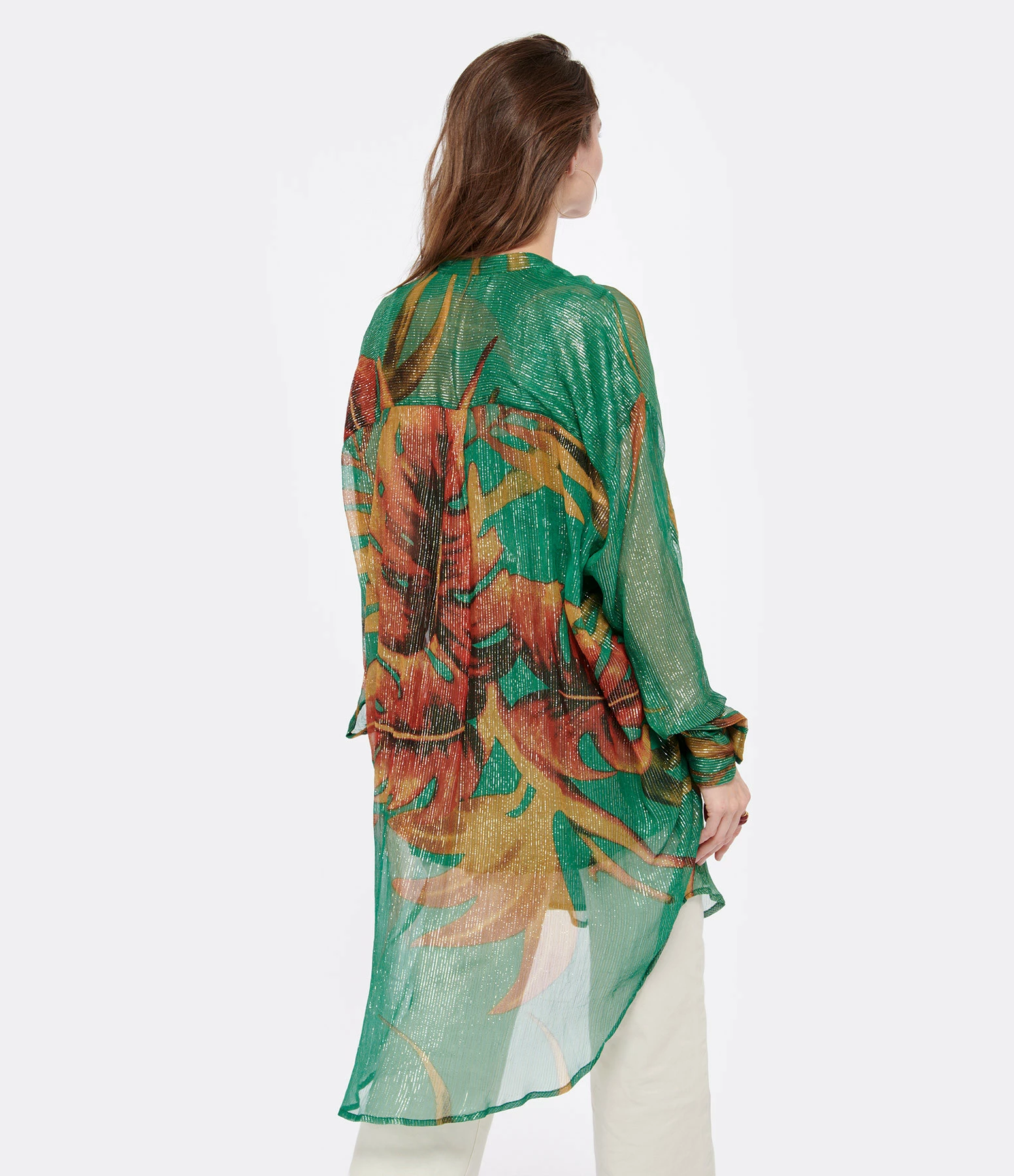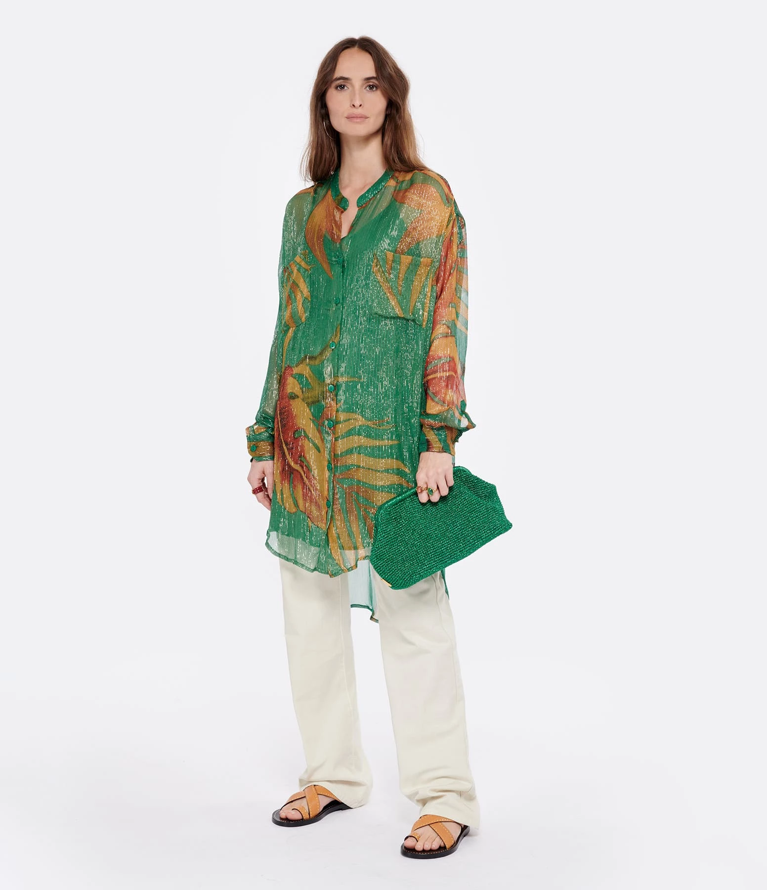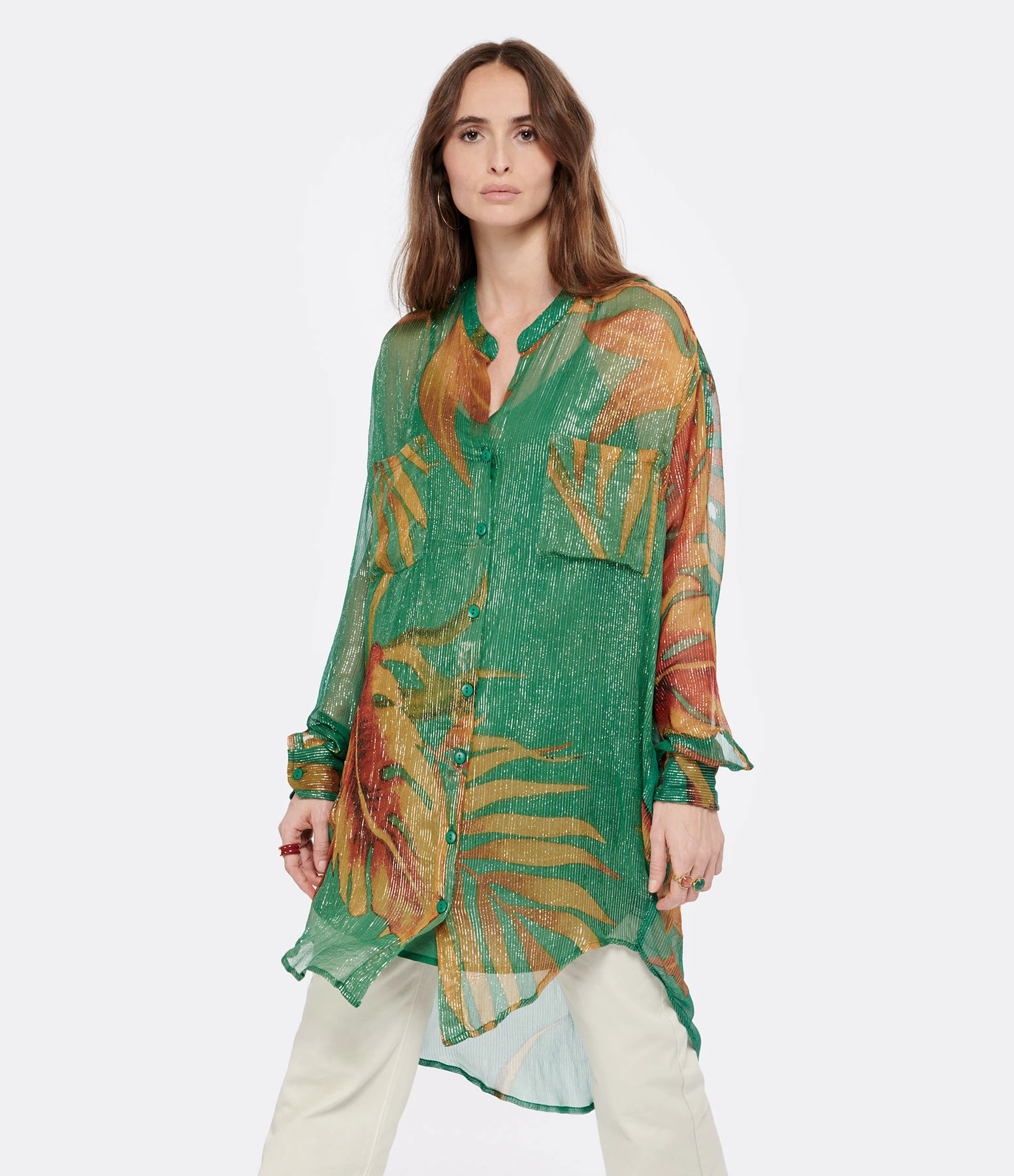 Chemise longue imprimé tropical avec fils dorés. Effet de transparence sur les bras. Fond de robe vert. Col chemisier. Manches longues avec fentes et poignets boutonnés. Fermeture à boutons verts sur le devant. Deux poches plaquées poitrine. Longueur plus longue dans le dos que sur le devant. Coupe droite. Base arrondie.