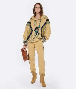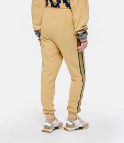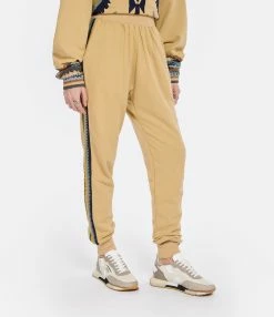 Pantalon de jogging beige. Taille élastiquée. Bandes latérales en maille crochet. Deux poches passepoilées sur le devant. Chevilles resserrées par élastique en coton molletonné.
