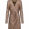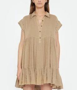 Robe marron à volants sur le bas. Col chemisier clouté. Fermeture par boutons sur le devant. Manches courtes cloutées aux bords. Coupe évasée. Base volantée. Doublée.