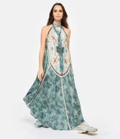 Robe longue à imprimé multicolore et rivets dorés. Col montant. Liens à nouer autour du cou. Fermeture par boutons à l’arrière. Couple ample. Base arrondie.