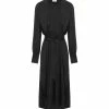 Robe en gaze de coton mélangé noir ornée d’un parement de raphia avec des perles brodées. Encolure en V. Manches longues bouffante. Coupe ample. Base droite.