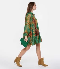 Robe courte ample à volants imprimé tropical avec fils dorés. Effet de transparence sur les bras. Fond de robe vert. Col chemisier. Manches longues avec fentes et poignets boutonnés. Fermeture à boutons verts sur le devant. Volants sur le bas. Doublée.