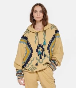 Sweatshirt beige à imprimés brodés. Col à capuche et liens de resserrage à pompons. Manches longues avec poignets au crochet. Coupe ample. Base droite
