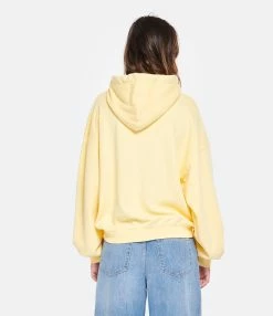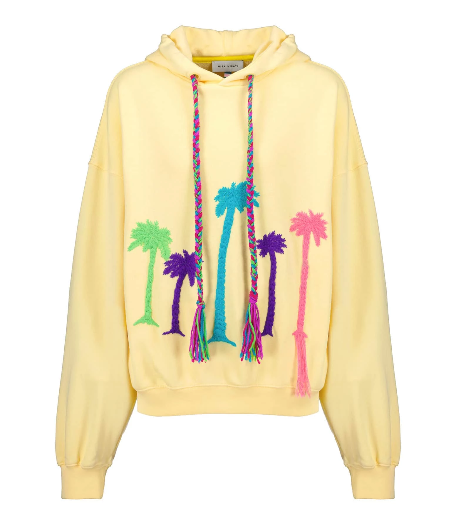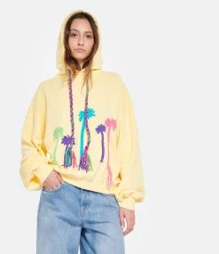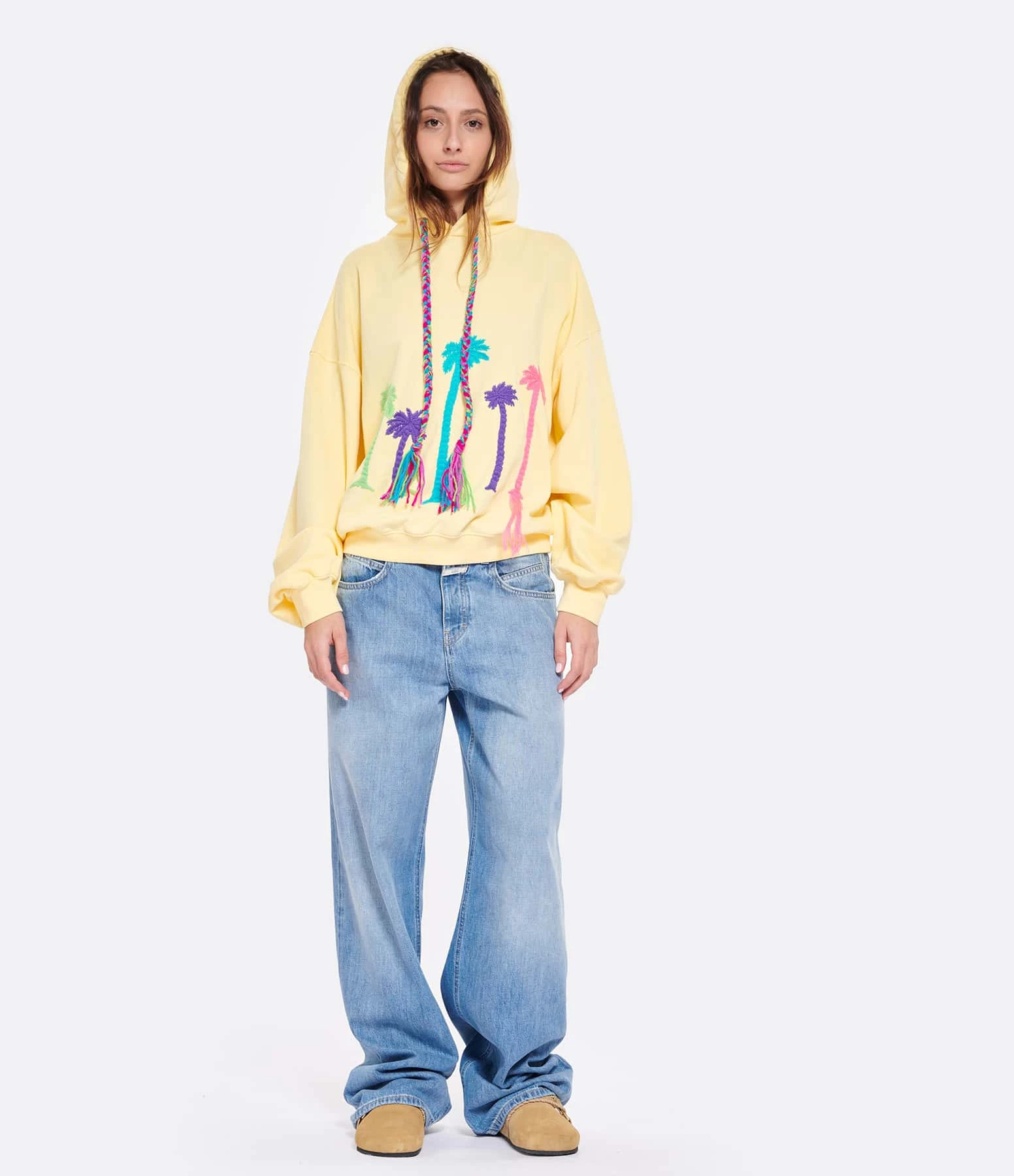 Sweatshirt jaune avec broderies de palmiers multicolores. Capuches avec liens de serrages multicolores. Manches longues avec poignets côtelés. Coupe droite. Base droite.