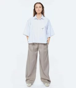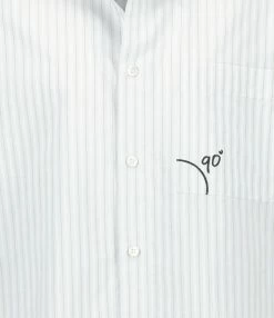 Chemise à rayures bleu ciel. Détails sérigraphié des angles. Une poche plaquée poitrine. Col chemisier. Fermeture par boutons blancs sur le devant. Manches trois-quarts. Coupe droite. Base droite.