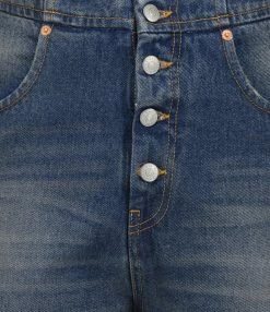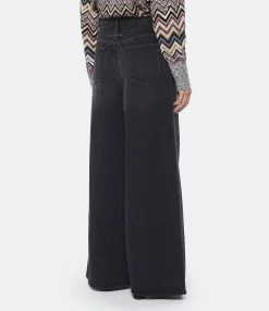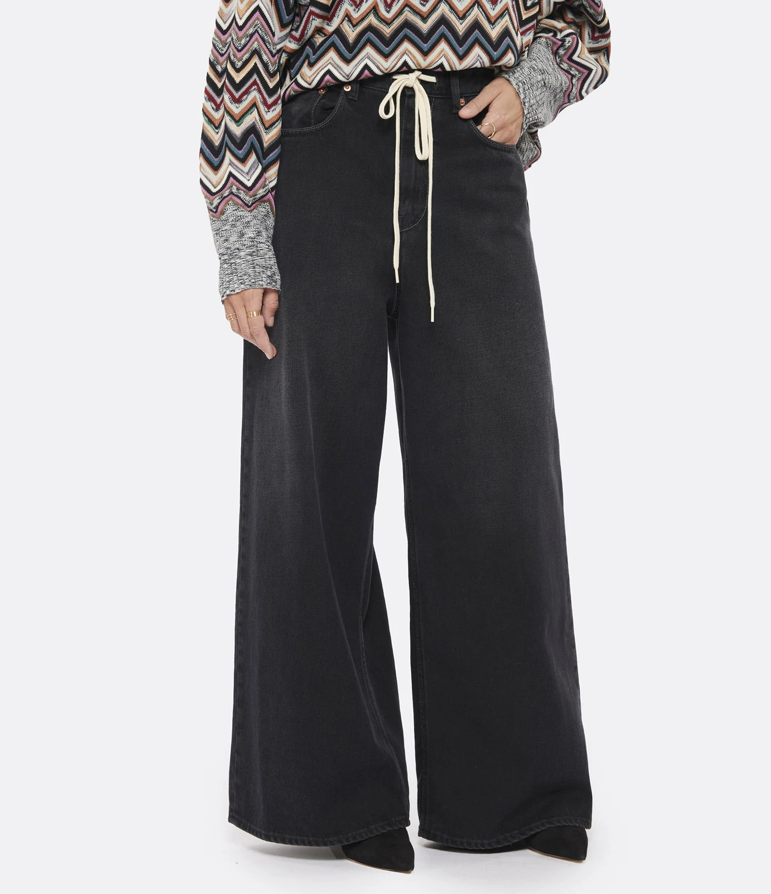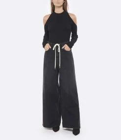 Jean en denim de coton noir. Braguette zippée. Boutons métalliques argentés avec logo gravé. Rivets rose gold. Passants pour ceinture et cordons de serrage à la taille.. Deux poches italiennes et une poche à gousset. Deux poches plaquées dans le dos. Coupe droite large. Base droite.