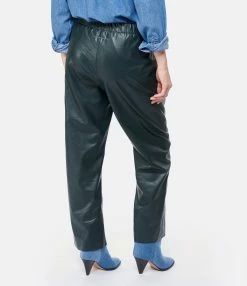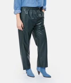 Pantalon en simili cuir vert foncé. Taille élastiquée. Deux poches. Coupe droite. Base droite.