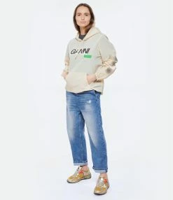 Jean boyfriend en denim de coton bleu délavé. Taille élastiquée. Effet d’usures par endroits. Deux poches à l’avant. Coupe boyfriend. Base droite.