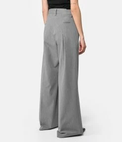 Pantalon de tailleur large gris. Taille haute avec passants pour ceinture. Deux poches à l’avant et une à l’arrière. Fermeture zippée et par crochet invisibles. Coupe droite. Base droite.