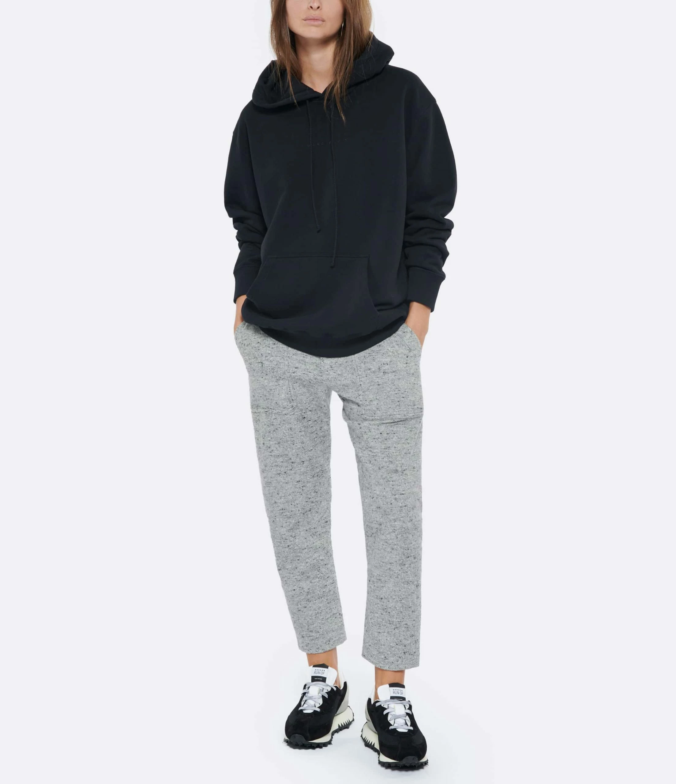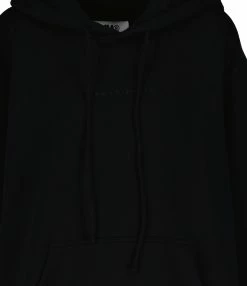 Sweatshirt en coton molletonné noir. Capuche avec liens de serrage. Inscription “MARGIELA 6” brodé sur la poitrine en noir. Manches longues. Poignets côtelés Poche kangourou. Coupe droite ample. Base droite côtelée.