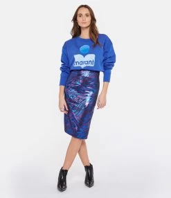 Jupe mi-longue irisée, à imprimé zébré violet bleu. Fermeture par zip à l’arrière. Coupe droite. Base droite.