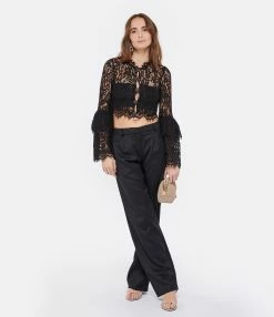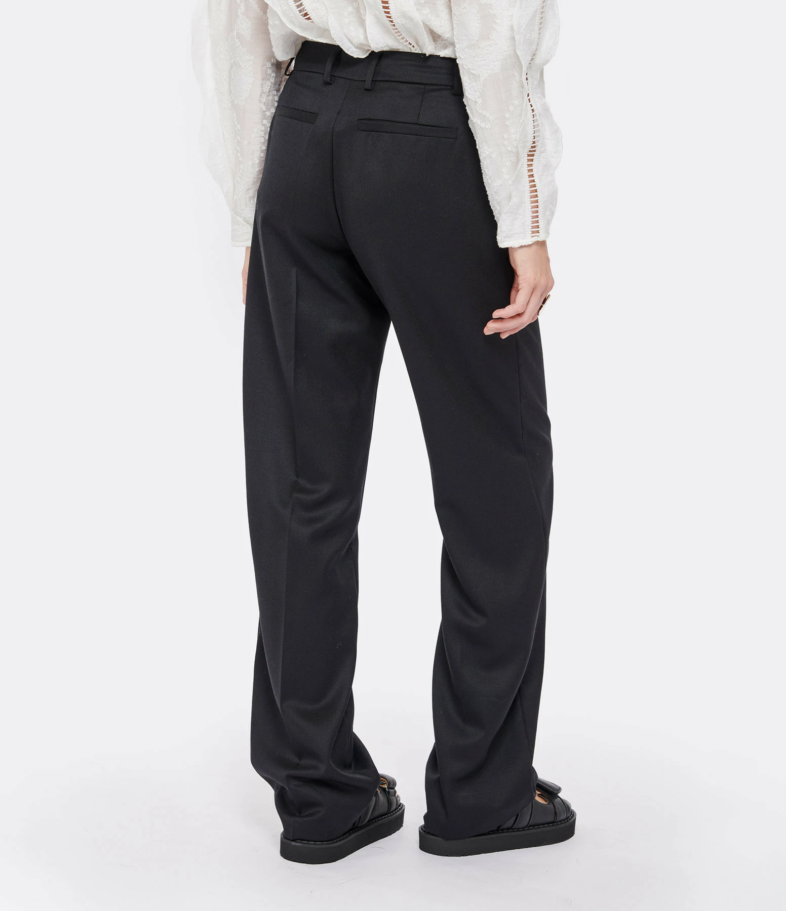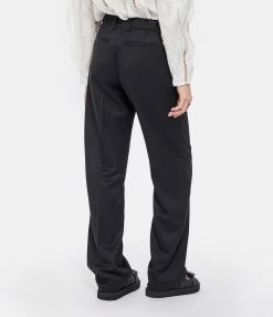 Pantalon à pinces en laine noire. Taille basse avec passants pour ceinture. Fermeture zippée sous la braguette et boutonnée sur le devant. Deux poches prises dans les coutures latérales sur le devant. Deux fausses poches passepoilées dans le dos. Coupe large. Base droite.