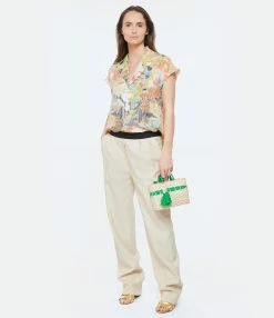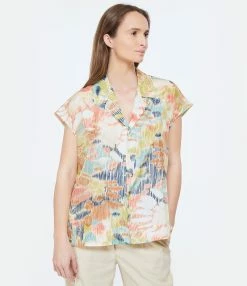 Chemise en soie à imprimé multicolore. Sans manches. Col chemisier. Fermeture par boutons sur le devant. Coupe droite. Base droite.