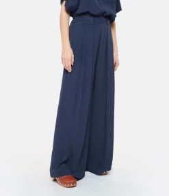 Pantalon fluide en soie bleu nuit Taille élastiquée. Deux poches à l’avant. Coupe fluide. Base droite.