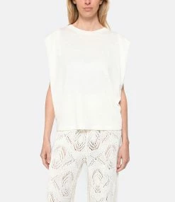 Pantalon large en coton et lin blanc. Passants pour ceinture. Fermeture zippée avec bouton. Deux poches italiennes latérales avec empiècements dorés. Deux poches plaquées au dos dont une à rabat. Doublé. Coupe droite ample. Base droite.