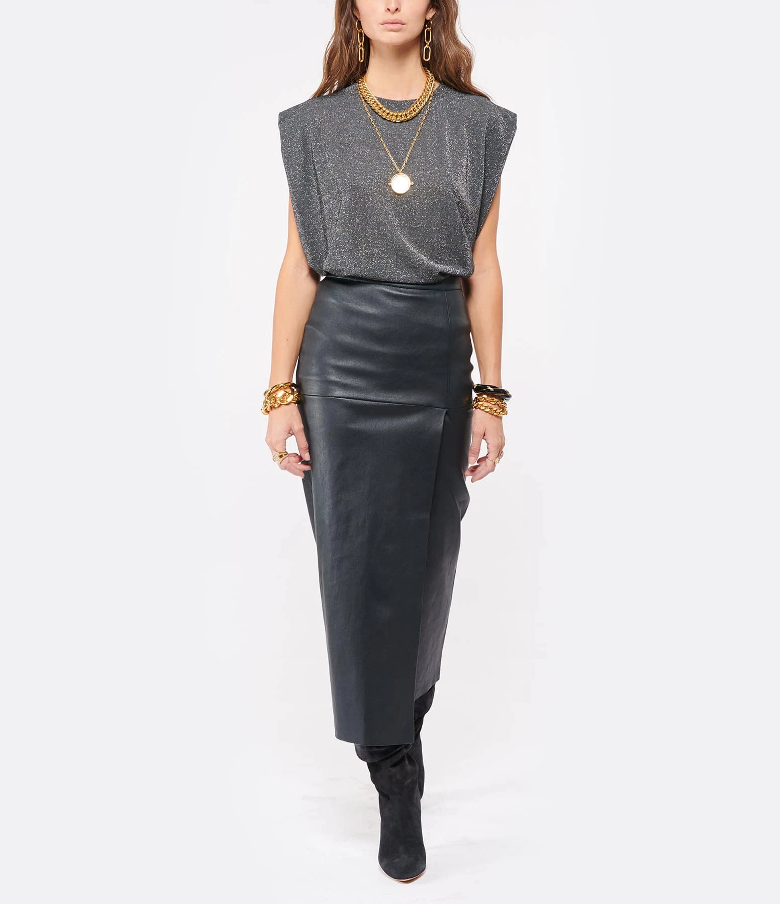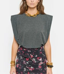 Débardeur gris pailleté. Col rond. Sans manches. Coupe droite. Base droite.