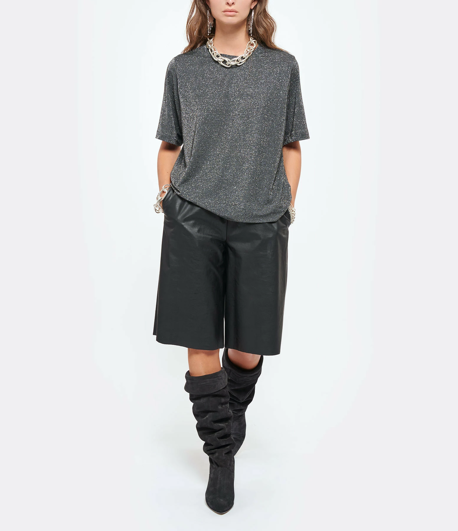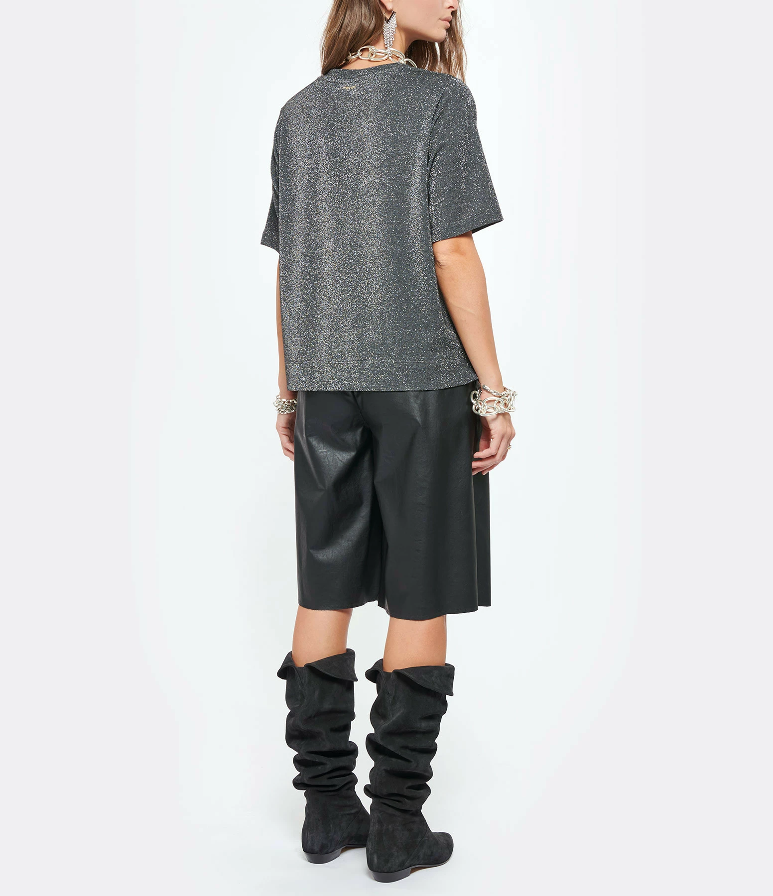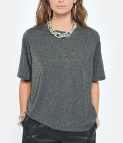 Tee-shirt gris pailleté. Col rond. Manches courtes. Coupe oversize et base droite. Légèrement fendu sur les côtés. Non doublé.