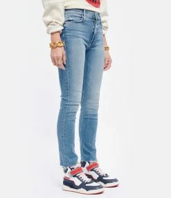 Jean slim en denim bleu délavé. Cinq poches. Fermeture par zip. Bas de jambe effiloché, coupé à cru. Coupe slim.