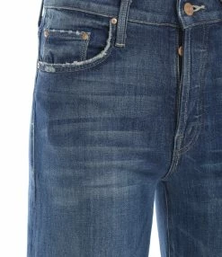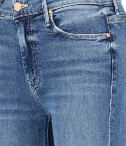 Jean slim en denim bleu délavé. Cinq poches. Fermeture par zip. Bas de jambe effiloché, coupé à cru. Coupe slim.