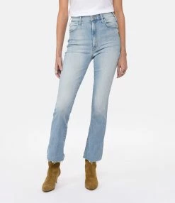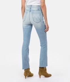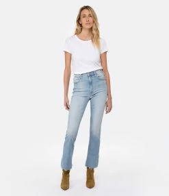 Pantalon en denim de coton bleu clair délavé. Taille haute avec passants pour ceinture. Braguette zippée et boutonnée. Deux poches italiennes sur le devant. Deux poches plaquées dans le dos. Coupe flare. Base droite avec bords effilochés.