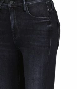 Pantalon en denim de coton bleu clair délavé. Taille haute avec passants pour ceinture. Braguette zippée et boutonnée. Deux poches italiennes sur le devant. Deux poches plaquées dans le dos. Coupe flare. Base droite avec bords effilochés.